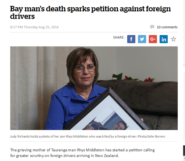 请愿发起人是朱迪•理查兹(Judy Richards)女士,她是一位交通事故受害者的母亲。她年仅23岁的儿子于今年2月在一起中国女游客造成的道路事故中死亡。司机是27岁的Jieling Xiao,她在新西兰旅游期间因“疏忽驾驶”和“经验不足”造成此次事故。Jieling Xiao当时持12个月新西兰工作签证,她有中国驾照,在新西兰可以合法开车一年,但从来没有在新西兰的公路上以50公里/时以上的速度开过车。
