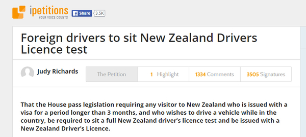 理查兹的请愿内容为:“吁请新西兰国会通过法律,要求赴新西兰且签证超过3个月的外国人,如果需要在新西兰境内开车,必须通过新西兰全驾照路试,在得到新西兰驾驶执照后才能上路。”